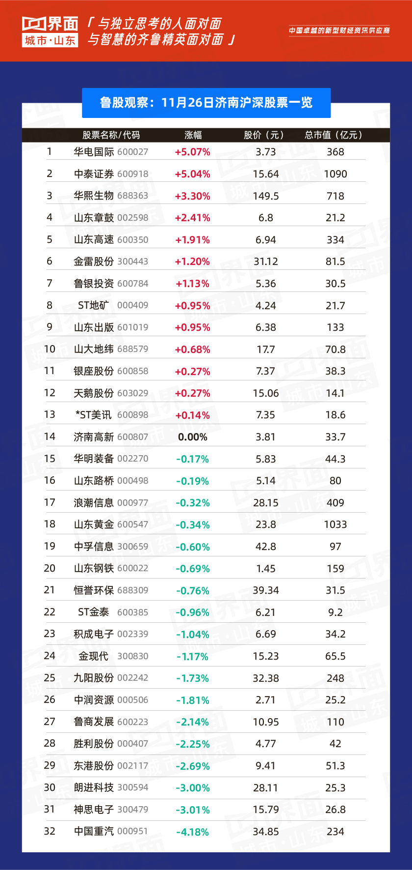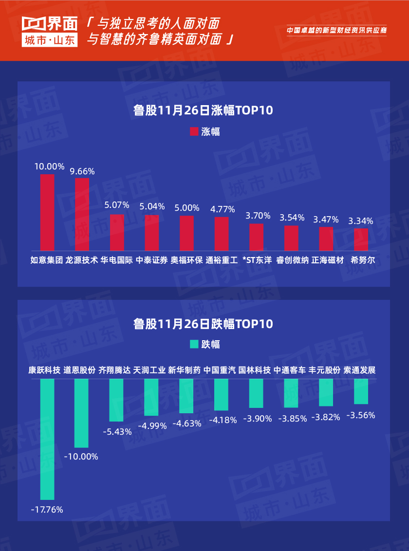 受大盘影响,11月26日,山东省内沪深股票有80只个股上涨,138只下跌,如意集团涨停。