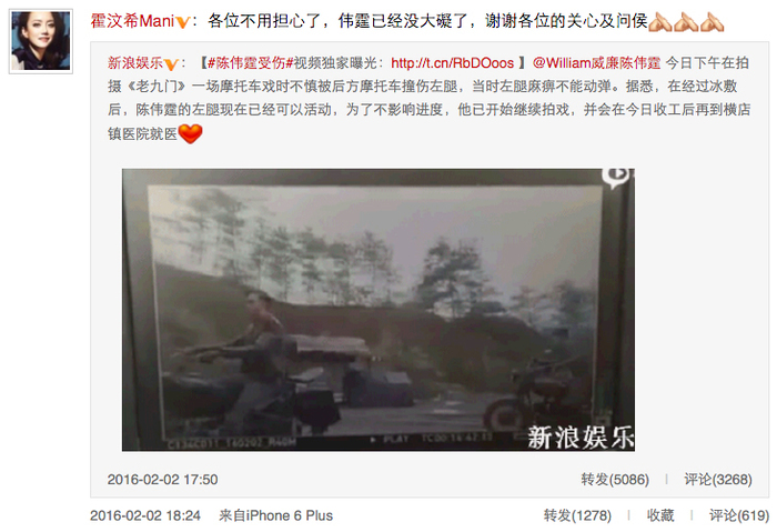 2月2日下午,阿诺工作室率先发布了陈伟霆在片场被摩托车撞伤的消息,左脚曾麻痹不能动弹。送医之后,其经纪人霍汶希通过微博报平安:“各位不用担心了,伟霆已经没大碍了,谢谢各位的关心及问候!”