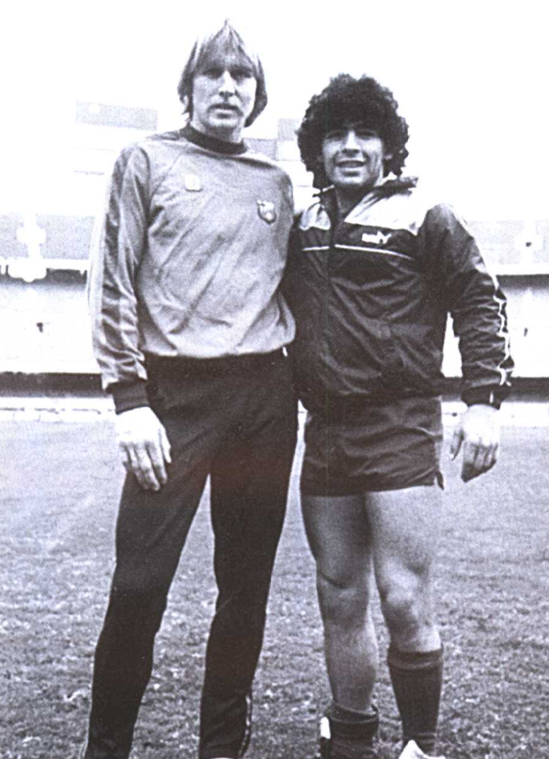 马拉多纳与舒斯特尔的合照。他回忆:可能是因为我们俩人都有点疯狂,他在我发起的几件事上都支持我。