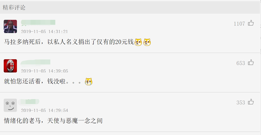 该文迅速在国内知名的足球社区APP中流传,粉到深处自然黑的球迷,在文章下留言:“马拉多纳死后,以私人名义捐出Lee仅有的20元钱”“就怕您还活着,钱没啦”。留言还加上了狗头,以免被友军误伤。