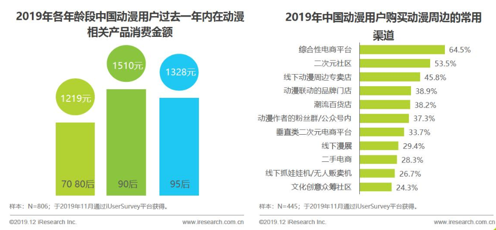 在2019年底,艾瑞咨询发布的《2019年动漫二次元人群营销价值白皮书》中提到,每年70、80后人均在动漫及相关商品上的支出达到了1200元以上,90后则高达1500元,就连95后都达到了1300元。