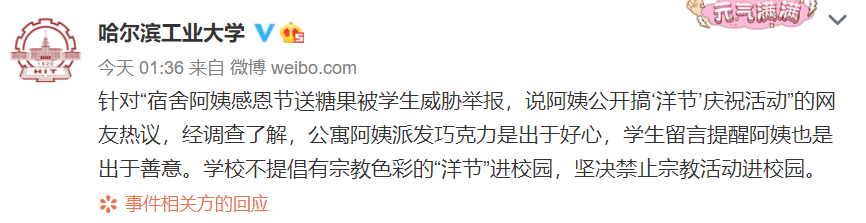 据@哈尔滨工业大学 微博消息,针对“宿舍阿姨感恩节送糖果被学生威胁举报,说阿姨公开搞‘洋节’庆祝活动”的网友热议,经调查了解,公寓阿姨派发巧克力是出于好心,学生留言提醒阿姨也是出于善意。