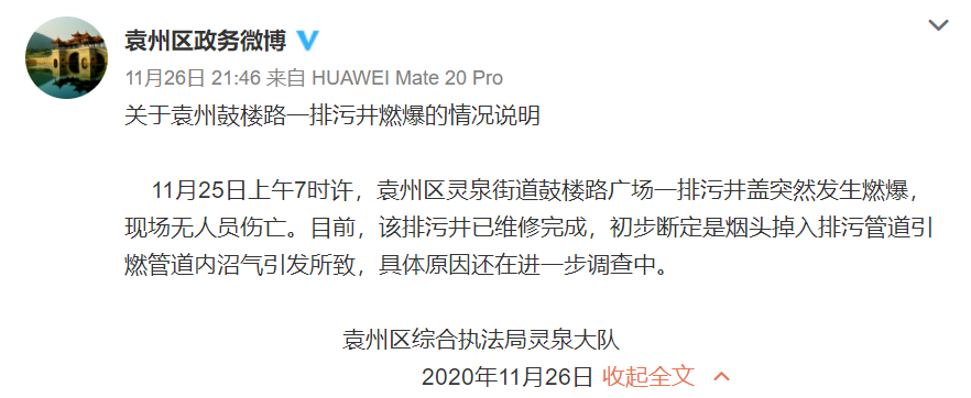 据@袁州区政务微博 消息,11月25日上午7时许,江西宜春市袁州区灵泉街道鼓楼路广场一排污井盖突然发生燃爆,现场无人员伤亡。目前,该排污井已维修完成,初步断定是烟头掉入排污管道引燃管道内沼气引发所致,具体原因还在进一步调查中。
