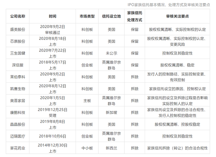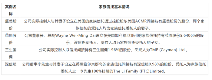 境内上市公司中存在家族信托架构的案例比较罕见,对于上市前存在家族信托架构的,拆除信托持股(转让家族信托股权)为常规的处理方式,典型者如A股上市公司迈瑞医疗,其在美国纽约证券交易所挂牌上市期间,实际控制人通过信托间接持有股份。其在回归A股上市前夕,即2016年7-12月,实际控制人将信托撤销转为直接持股,并于2017年5月在创业板申报;又如凯赛生物,在反馈问询阶段拆除家族信托。仅有盛美股份、芯原股份、深信服、三生国健等案例保留家族信托并获审核通过。