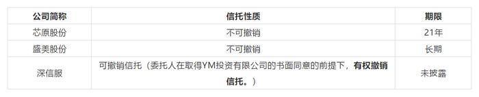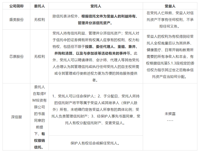 盛美股份、芯原股份、深信服均授予受托人广泛的信托权利,由受托人作为信托控制权人,管理、持有、分配信托财产,有效避免权利冲突。