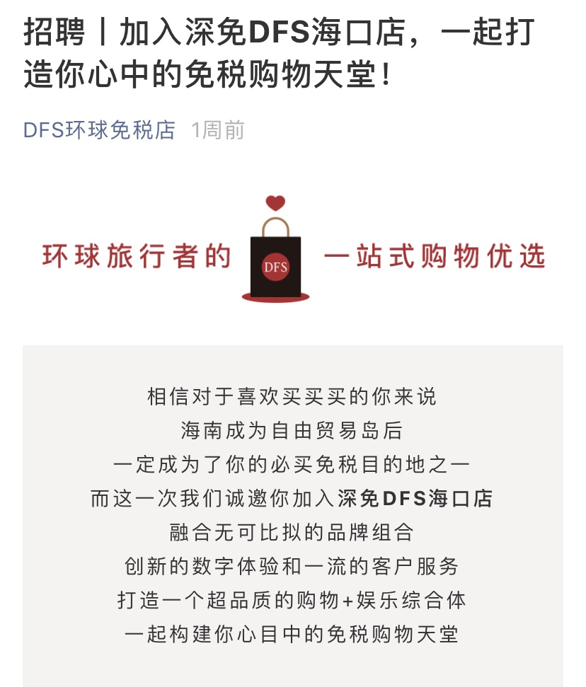 界面时尚记者注意到,LVMH集团旗下奢侈品旅游零售商DFS集团近日在官方微信公众号发布招聘公告,为深免DFS海口店招聘员工。