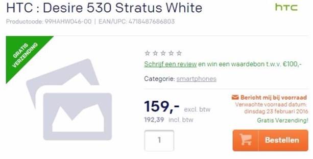 【约合1293元 HTC或在MWC 2016上推Desire 530】HTC极有可能在近期内推出Desire 530,这款尚未正式发布的智能手机目前已经亮相荷兰的第三方电商平台。尽管产品页面并未提及关于该设备的具体规格,但却提供了关于产品售价和发售日期的相关信息,不过现在该产品页面已经下架。援引外媒GSMArena报道,荷兰在线零售商Centralpoint新上线的产品页面显示HTC Desire 530售价约合190欧元(约合1293.0元),预计将于今年2月23日上线发售。这暗示着该机会在今年2月22日至25日在西班牙巴塞罗那召开的MWC 2016大会上发布,该机可能是Desire 526的继任者。