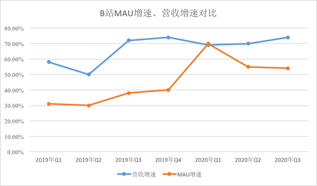另一方面,除今年一季度,B站的营收增速一直高于MAU增速,例如最近一次,54%的MAU增长,带来74%的营收增长,证明单个活跃用户创造出更大的收入,活跃用户增长和营收增长呈现良性循环,OGV带节奏,妥妥的加分项。