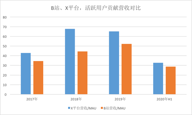 但同样在2019年,B站MAU也暴增,但它单个月活用户贡献的营收不降反升,与X的差额加速缩小,从23元减至13元,再到今年上半年的3.9元。