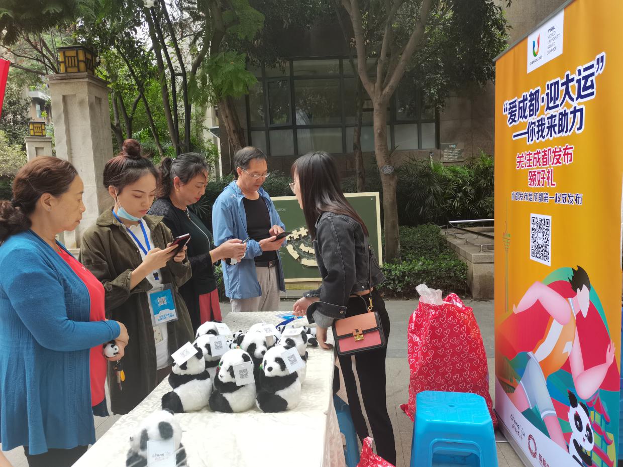 在活动中,工作人员们在通过赛事宣传、游戏互动、文创礼品发放等方式,为社区居民们送去精美实用的小礼物,宣扬大运会精神,传递大运会的青春活力。