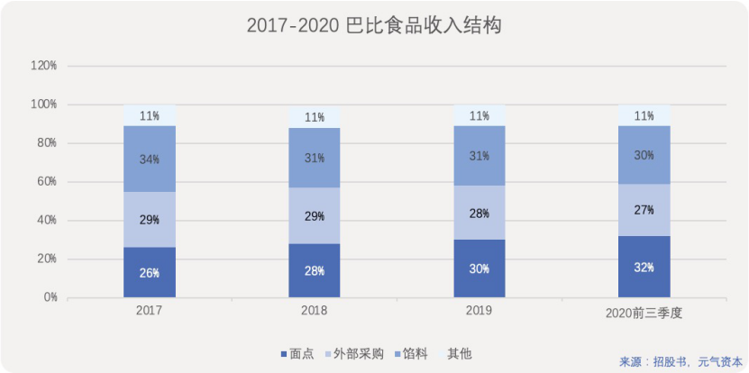 从成本结构拆分来看,巴比符合食品公司特征,直接材料的占比最大。