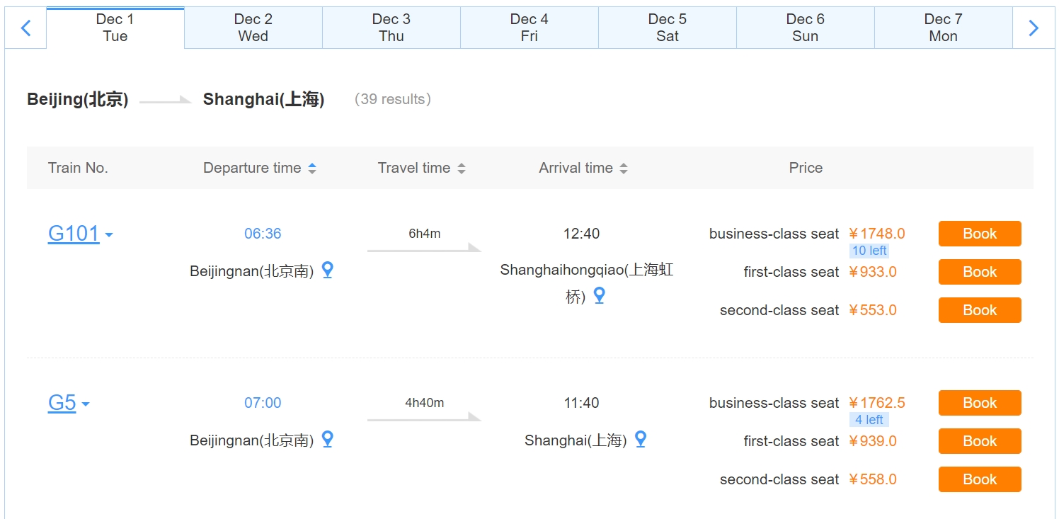 购票流程与中文网站类似,车站名提供中英文对照,车票余量较少时会出现提示。