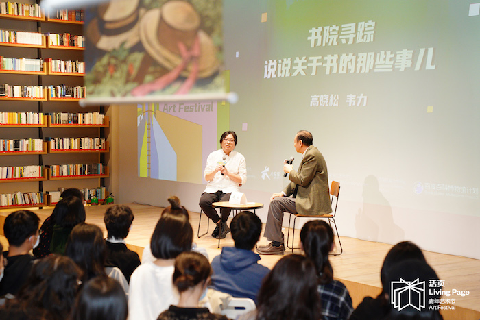 在开幕式现场,我们听了一场由著名音乐人、导演、作家高晓松与著名藏书家、作家韦力的对谈。作为本次活动“嘉宾对谈”单元的首发活动,他们以“书院寻踪——聊聊图书那些事”为主题,从古至今书的内容、装帧、出版的发展变化,到古代书院与当下图书馆、文艺空间、学校的区别,分享了自己的观点。
