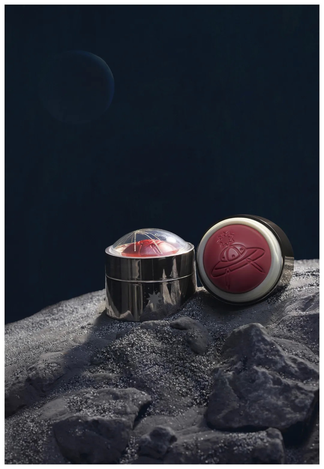 品牌最早的破圈单品是情绪腮红,采用正方形纸制包装,小宇表示选用基础图形正方形做为产品包装形态是把产品想象成魔力口袋,打开来体验情绪,而像宇宙系列的腮红球的包装设计看起来像是腮红“端坐”在太空舱中,也是完美做到将内容融入了产品的包装设计。