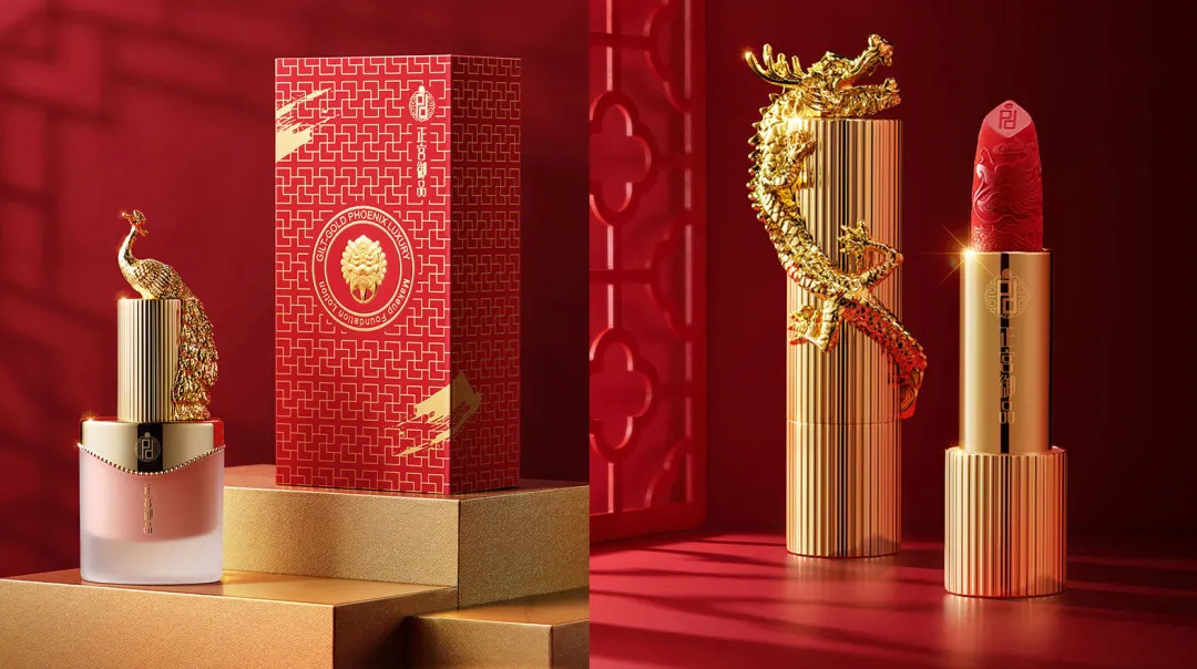 帕特团队的另一个国风彩妆案例是为正宫御品设计的鎏金系列小金龙口红,与花西子的“小家碧玉”不同,正宫御品主打宫廷风,因此该系列产品包装上的龙与凤是使用锌合金浇筑雕刻而成,并且外包装花盒上也是选用了能反映出宫廷风的门窗元素。