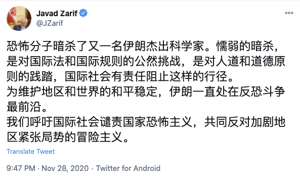 北京时间11月28日晚,伊朗外长扎里夫用中文发推称,恐怖分子暗杀了又一名伊朗杰出科学家。他写道,“懦弱的暗杀,是对国际法和国际规则的公然挑战,是对人道和道德原则的践踏,国际社会有责任阻止这样的行径。”