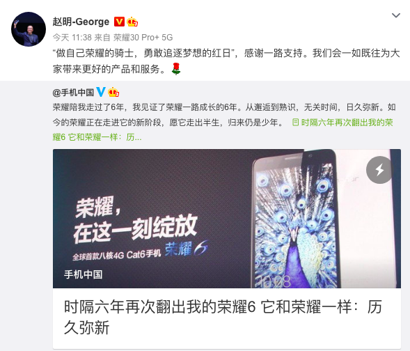 11月29日,荣耀终端有限公司CEO赵明通过个人微博发文称,“做自己荣耀的骑士,勇敢追逐梦想的红日”,感谢一路支持。我们会一如既往为大家带来更好的产品和服务。