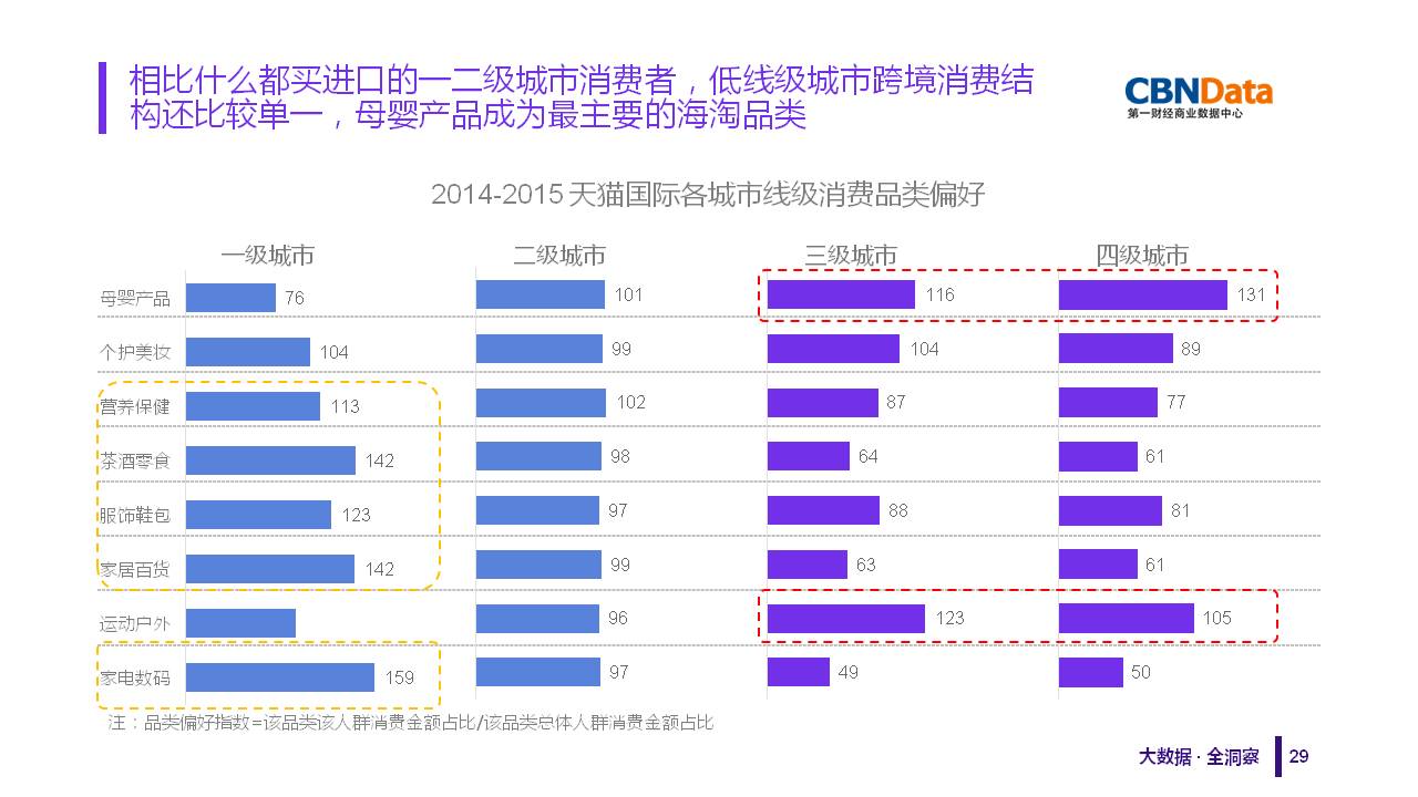 随着国民生活水平的提高,低线级城市居民购买能力上升,市场需求增长,由于线下进口商品渠道不够丰富,三四级城市人群跨境消费偏好明显高于一二级城市,跨境电商已出现渠道下沉的趋势。相比什么都买进口的一二级城市消费者,低线级城市跨境消费结构还比较单一,母婴产品成为最主要的海淘品类。有这样一个人群,他们集中在三四级城市,主要是处于二三十岁生育年龄段的男性,最爱买的品类是奶粉尿裤等母婴用品。