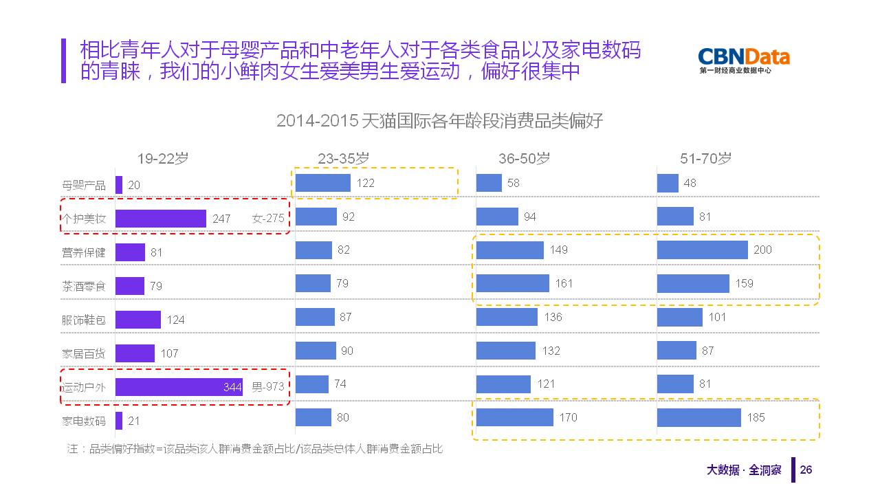 自2014年初天猫国际上线以来,95后们的消费占比逐步增长,市场前景可观。相比青年人对于母婴产品和中老年人对于各类食品以及家电数码的青睐,95后年轻人的偏好主要集中在个护美妆和户外运动产品。