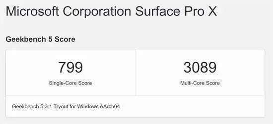 而运行在微软 SQ2 处理器上的 Windows 10 on ARM,单核成绩为799,多核成绩仅为3089。再次证实了苹果M1芯片组较高通竞品大幅领先。