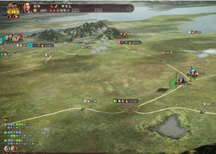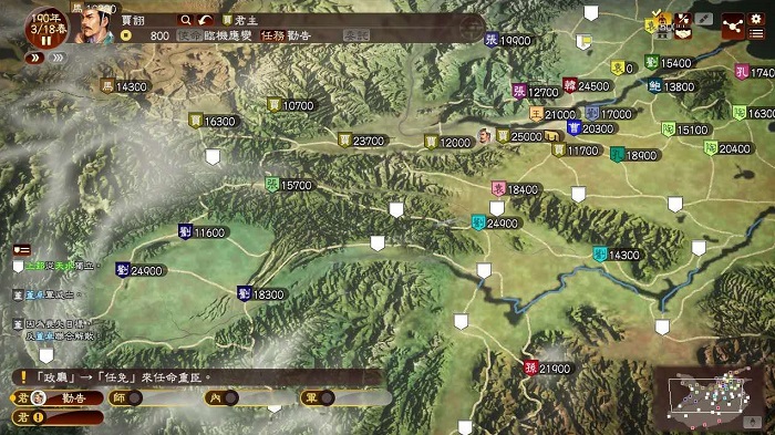 如果玩家选择扮演一个势力的主公,能够进行的行动会稍微多一些,可以为势力设定目标进行内政外交,也可以攻打敌人的城市,这与《三国志》历代作品并没有太大的区别。但是,即使作为主公来下达命令给自己麾下的将领,玩家也需要数量有限的任务信,这样一来,如果玩家直属的城市里人才较多的话,很有可能会有不少家伙无所事事。