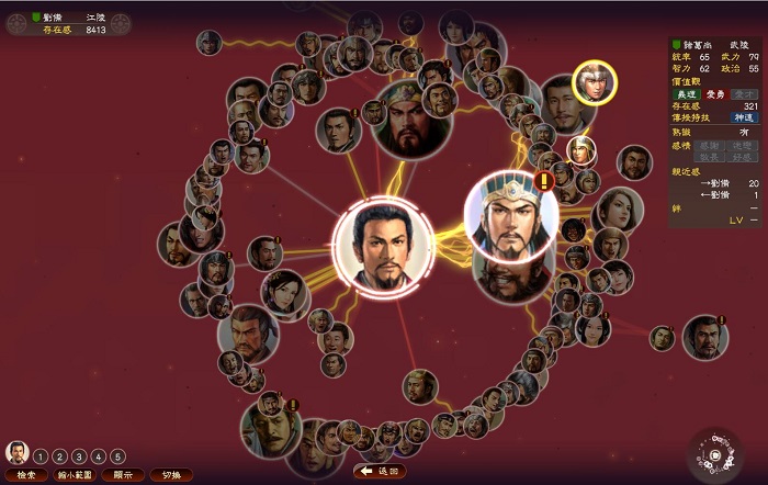 下大力宣传的人际关系系统看似很有意思,但实质上却欠点火候。玩家可以通过送礼或者协助进行内政来提升自己与某个将领的好感度,并且建立“绊”。不过在实际游戏中,能够提升好感度的途径相对较少,建立“绊”的任务也只有寥寥几种。但令人疑惑的是,虽然游戏中用了很多的笔墨向玩家推荐这一系统,但玩家只能通过这个系统做的事情却很少:相同阵营的角色如果存在“绊”并同时出现在战场上,战力会提升;“绊”在玩家挖角其他将领,或者煽动叛乱也有作用。但即使与敌国武将建立了“绊”,要对其进行拉拢策反也并不是一件容易的事情。这样一来,这个系统存在的价值就有些尴尬了,甚至会让人觉得画蛇添足。不过这一系统在另一方面满足了玩家建立自己“三国关系网”的愿望。