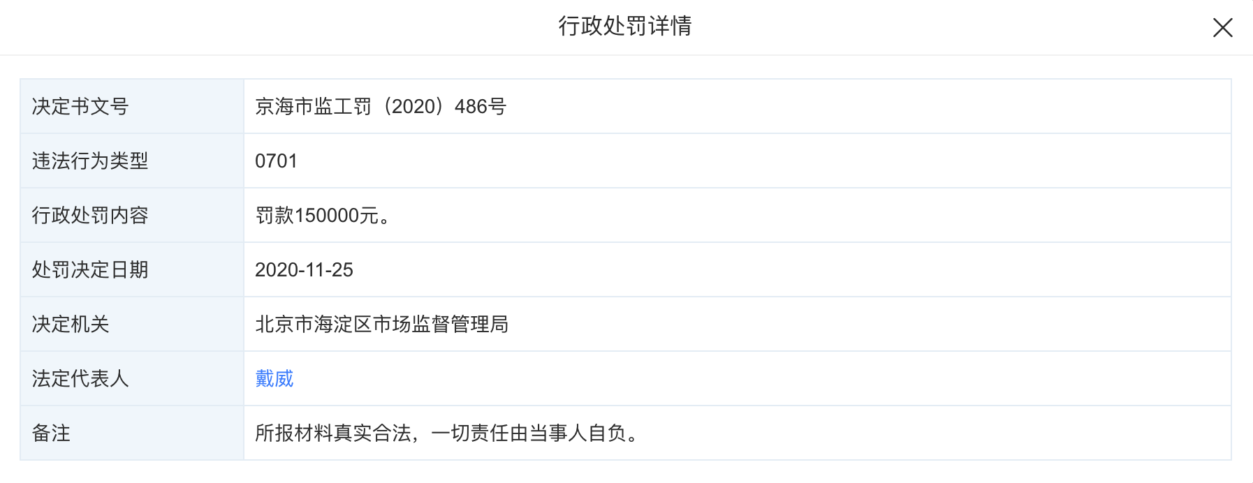 据天眼查APP显示,11月25日,ofo小黄车的关联公司北京拜克洛克科技有限公司新增1条行政处罚信息,决定文书号为京海市监工罚(2020)486号,决定机关为北京市海淀区市场监督管理局,处罚结果为罚款150000元。