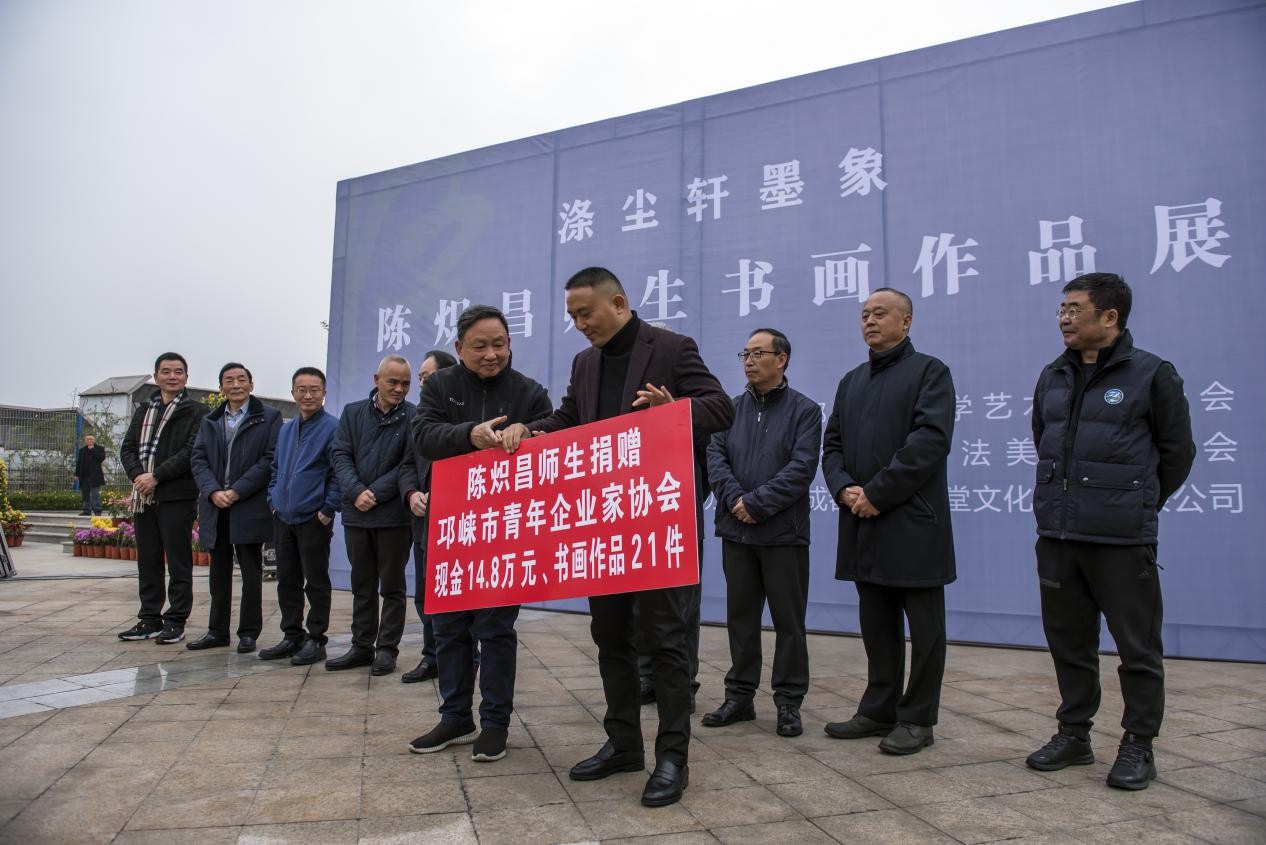 薪火相传育桃李,翰墨飘香写春秋。11月29日,四川邛崃瑞云欣广场艺术展厅,翰墨生香,菊香弥漫,人潮如涌。中国书法家协会会员、原邛崃市书法美术家协会主席陈炽昌师生书画展隆重举行,现场向邛崃市青年企业家协会捐赠现金14.8万元、书画作品21件,支持开展培训教育,助力薪火传承。