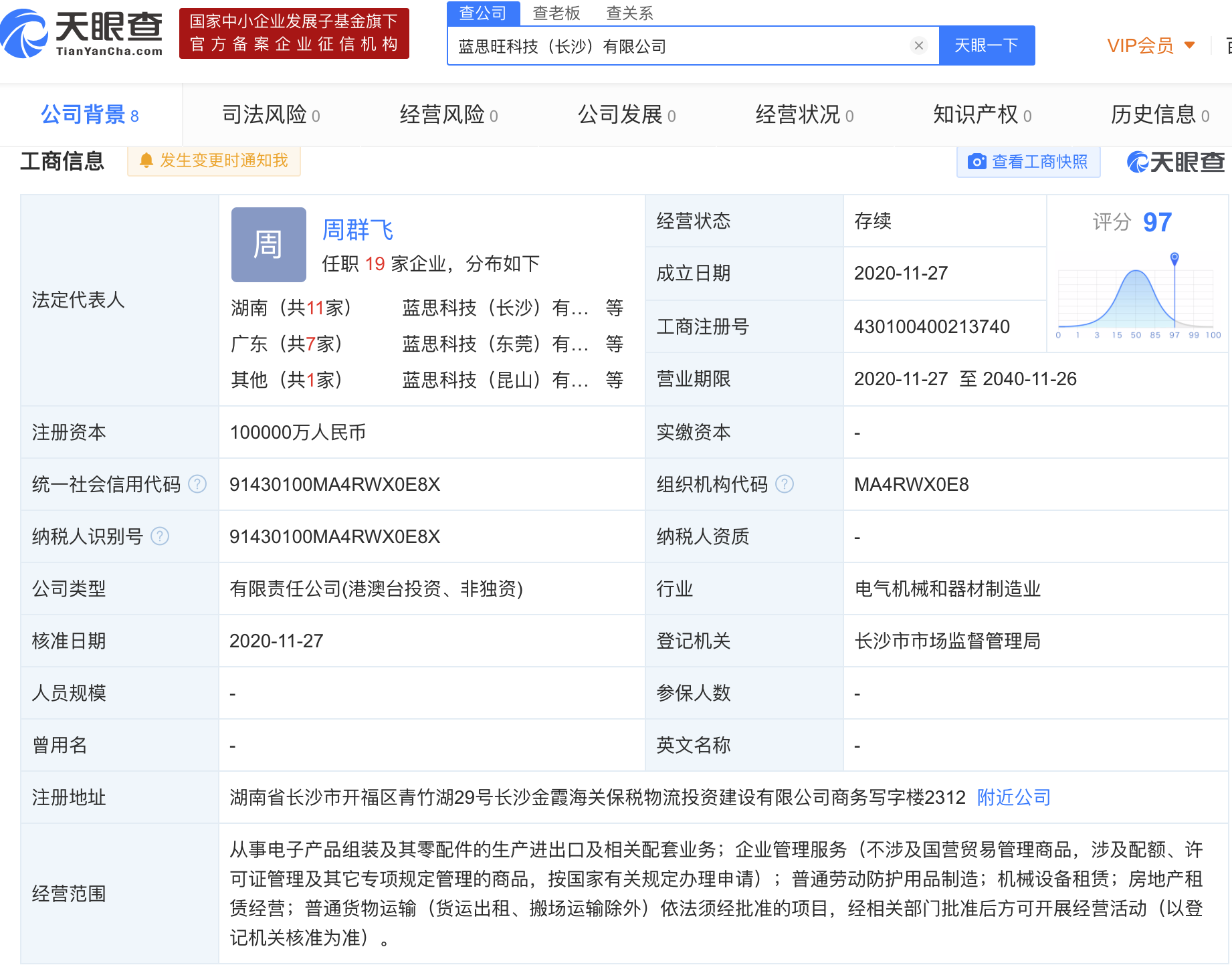 据天眼查APP显示,11月27日,蓝思旺科技(长沙)有限公司成立,注册资本为100000万人民币,法定代表人为周群飞,注册地址为湖南省长沙市开福区,经营范围包括从事电子产品组装及其零配件的生产进出口及相关配套业务;企业管理服务等。该公司第一大股东蓝思科技股份有限公司,持股比例为75%;蓝思国际(香港)有限公司持股25%。