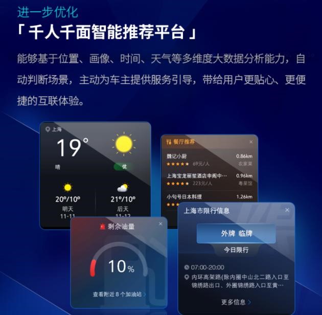 根据用户的用车习惯和偏好,新升级的车载娱乐信息系统还进一步优化千人千面智能推荐平台,并能够基于位置、画像、时间、天气等多维度大数据分析能力,自动判断场景,主动为车主提供服务引导,带给用户更贴心、更便捷的互联体验。