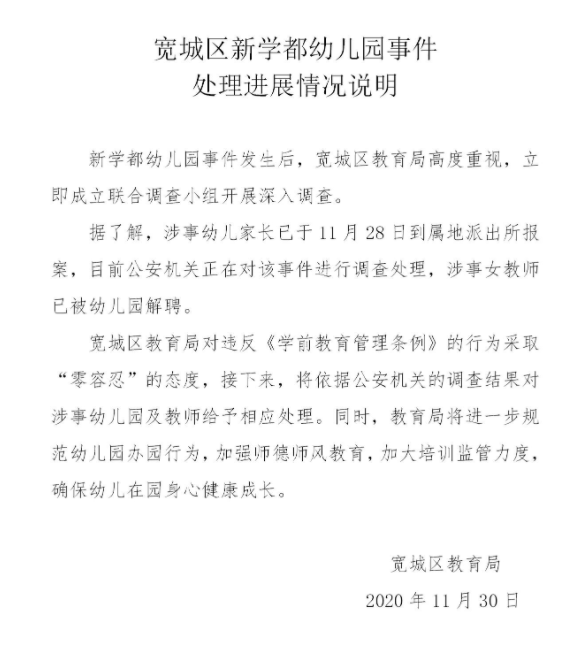 11月30日,长春市宽城区人民政府网发布《宽城区新学都幼儿园事件处理进展情况说明》称,涉事幼儿家长已于29日到属地派出所报案,目前公安机关正在对该事件进行调查处理,涉事女教师已被幼儿园解聘。