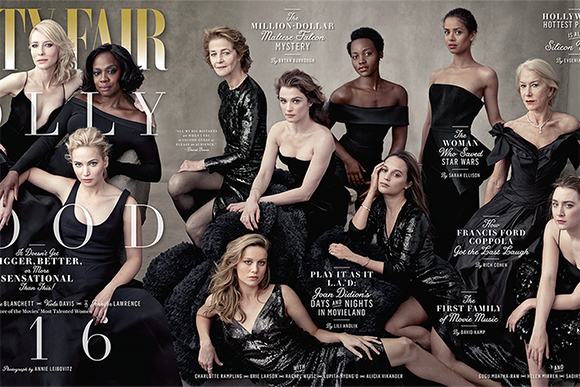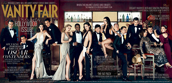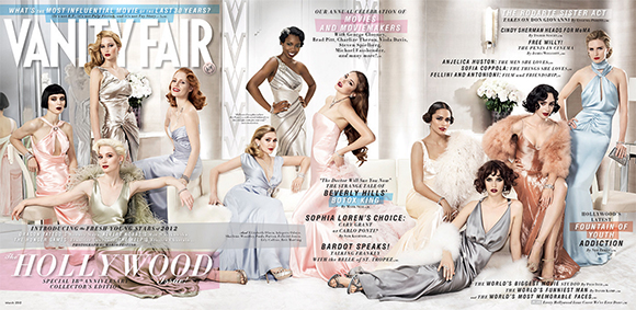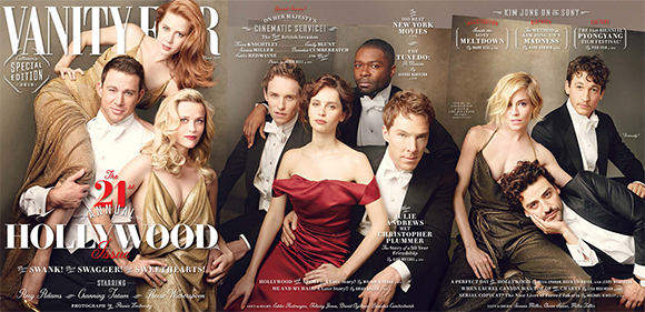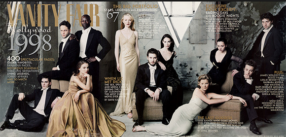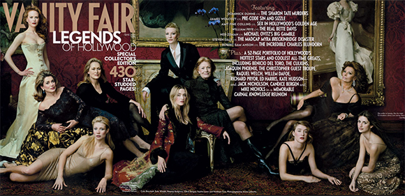 从 1995 年开始,《名利场》杂志每年 3 月号或 4 月号都会做一期好莱坞特刊。由御用摄影师 Annie Leibovitz 操刀,请来数位当红好莱坞明星来拍摄 3 联的大跨页封面。同时大跨页明星大合影,《名利场》的封面比数月前另一本中国时尚杂志要高明许多。