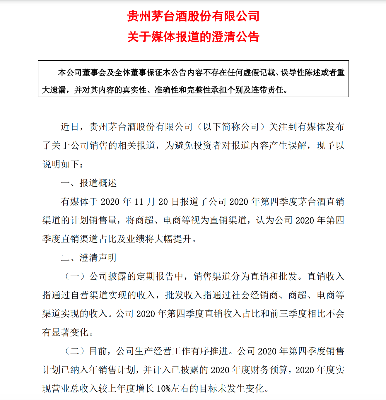 这些被引发的市场关注最终又触动了茅台的神经。11月23日,贵州茅台发布澄清公告,称“公司披露的定期报告中,销售渠道分为直销和分销。直销收入指通过自营渠道实现的收入,批发收入指通过社会经销商、商超、电商等渠道实现的收入。贵州茅台酒公司2020年第四季度直销收入占比和前三季度相比不会有显著变化。”