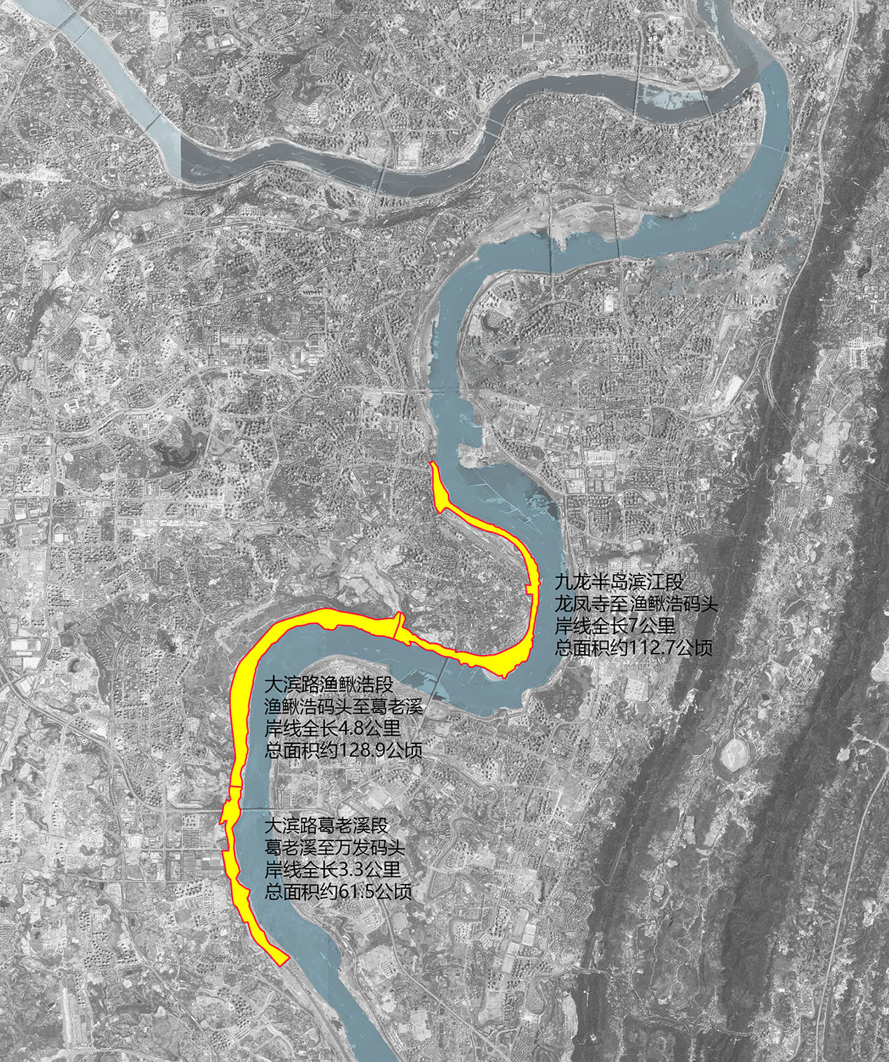 其中,九龙半岛滨江段起点始于龙凤寺,终点至渔鳅浩码头,岸线全长约7.0公里,面积约112.7公顷;大滨路渔鳅浩段起于渔鰍浩,终于葛老溪,岸线长度约4.8公里,面积约128.9公顷;大滨路葛老溪段起于葛老溪,终于万发码头,岸线长度约3.3公里,面积约61.5公顷。