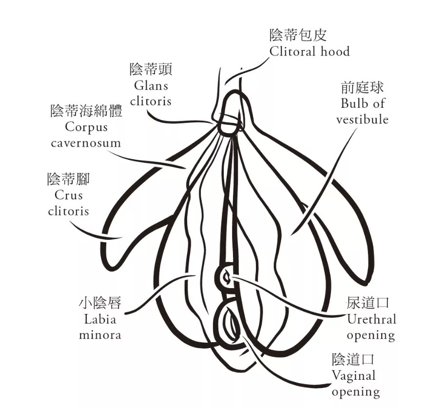 尽管在一般的认知中,阴蒂只是一颗“小纽扣”,但它其实是“整体范围很大,多半位于体内,仅有顶部从外阴部顶端冒出的解剖构造”。