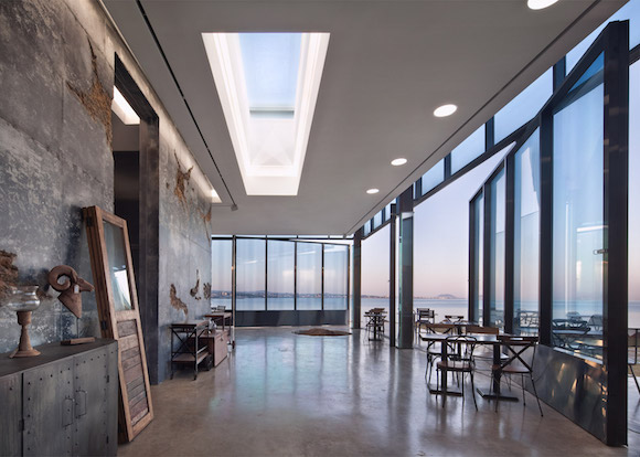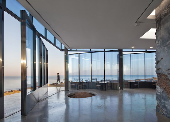 整个咖啡馆的建筑主体主要以火山沙、海边岩石、废旧钢板及反光性能突出的大幅玻璃为主要建筑材料——入口及登上屋顶露台的过道围墙都由石头垒成;楼梯则使用了废旧的钢板,仔细看甚至还能看见一些奇怪的编号;而咖啡馆的外墙是选用了大幅玻璃,做成了全开式的落地窗。