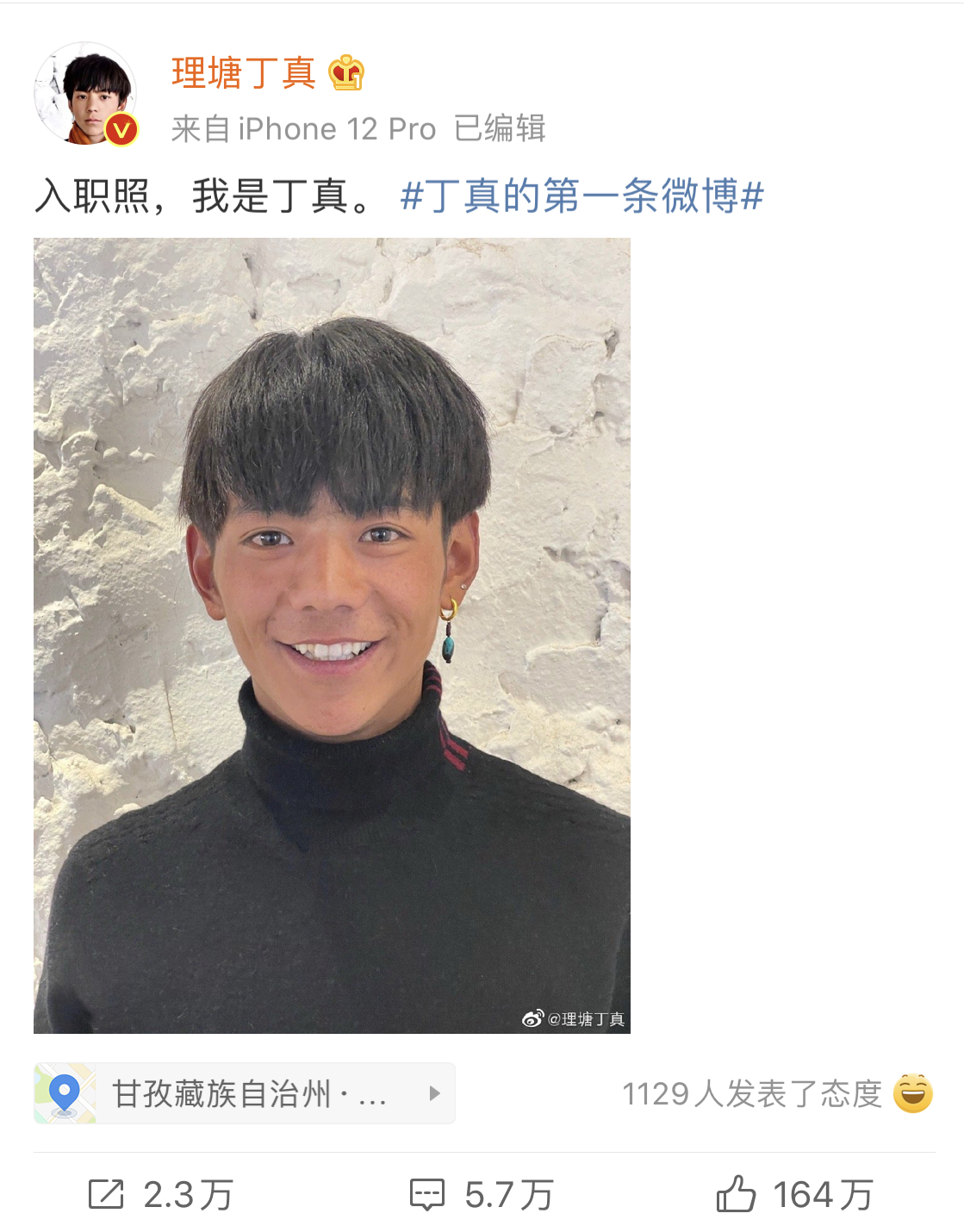 生活在四川甘孜理塘的丁真无意中被摄影师胡波(@微笑收藏家-波哥)捕捉,因为抖音上一条不到10秒的短视频而吸引了巨大关注。黝黑的皮肤、纯真又羞涩的微笑、民族风情的服饰,再加上一双清亮的眼眸,这个不到20岁的康巴汉子火速成为大众追逐的“甜野男孩”,其个人账号在抖音上发布的第一条视频点赞量突破了235万,粉丝数超过了369万。在微博,在连续几天时间里,围绕丁真的话题更是带来了十数条热搜。