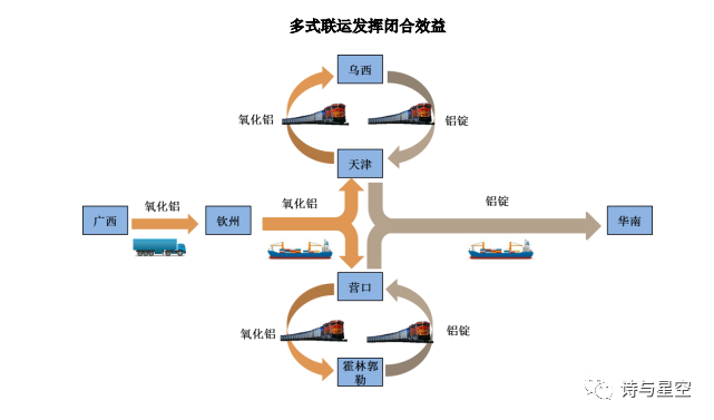 广西的氧化铝用货车集装箱运到钦州,然后船运到营口,再从营口铁路运输到霍林郭勒。在霍林郭勒生产成铝锭后,再经营口港船运到华南。