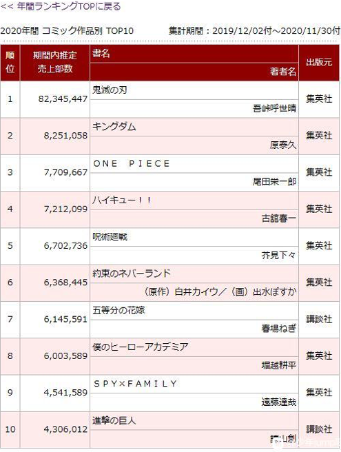不过最终卷初版销量虽然未能再破纪录,但是于今日公布的2020漫画年度销量榜单上,《鬼灭之刃》还是以8235万5447卷毫无悬念地拿下榜首,甚至比第二位到第10位的总和还要高(5724万0906卷)。