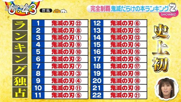 不仅仅是院线成绩,《鬼灭之刃》在漫画销量上也首屈一指,10月第三周,甚至实现了包揽Oricon榜1~22位的壮举。