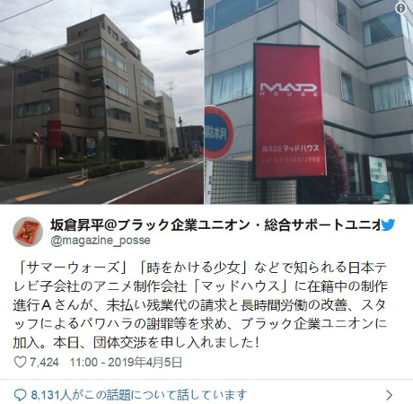 业界ufo、madhouse(甚至有员工工作时长达到每月393小时的地步)A1等动画公司都有过严重加班被当地媒体曝料的案例,在业界许多动画公司,300~400的月工作市场成为常态,甚至有每月600小时的情况(2014年,A1-Pictures员工辞职后自杀),与员工获得的薪酬相比,这种加班常态是过于疯狂的。