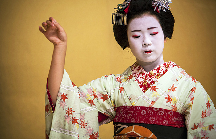 日本京都祗园,舞伎们正在演绎一种京东特色舞蹈。艺伎的手没有涂白,是为了显示艺伎的清洁,好在提供餐饮服务时让客人放心。