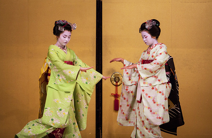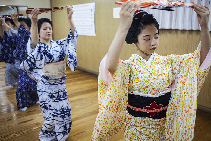 日本京都,艺伎和舞伎正在上舞蹈课。舞伎需要花费5年的时间来学习音乐舞蹈,学习如何舒适优雅地和顾客交流。