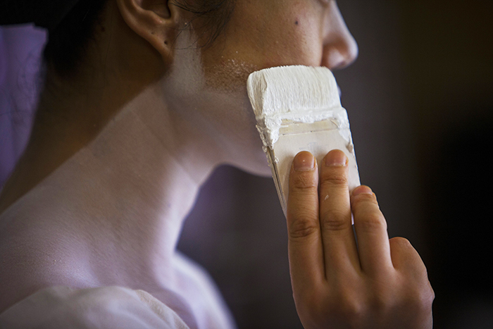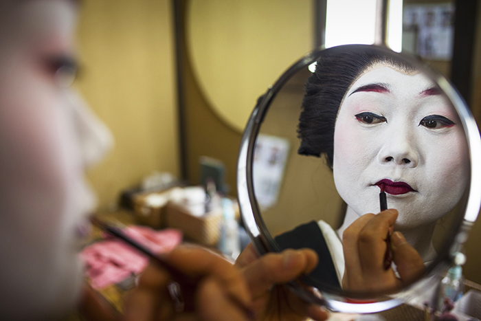 日本京都宫川町,一名艺伎在化妆。白色脸部上妆点红色,是为了让女性看上去更加妩媚。