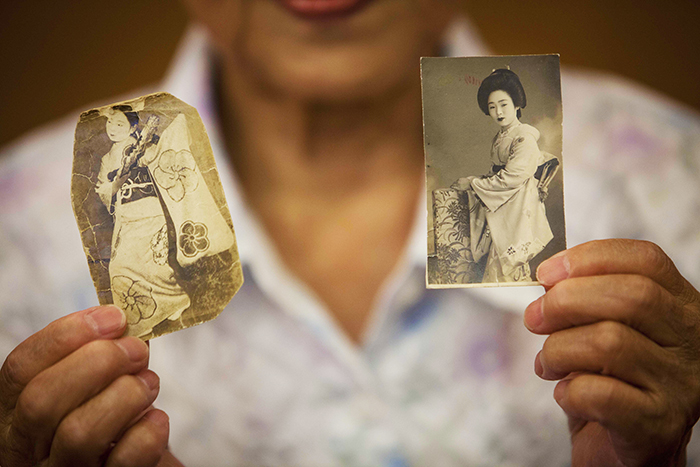 日本京都宫川町,一名从前的艺伎Mieko Yamada展示年轻时的照片,她现在从事的是一项主要负责歌唱或者演奏乐器的工作,陪同艺伎表演。她生活在艺伎屋。在二战以前,绝大部分艺伎是为了生计,被迫从事这一职业的。