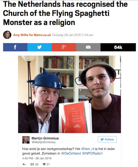据英国媒体《Metro》、《Christian Times》等报道,荷兰政府将“飞天面条神教”(Flying Spaghetti Monster,简称FSM)正式认定为合法宗教并且颁布了授权书,全球FSM信徒纷纷吃面庆祝。