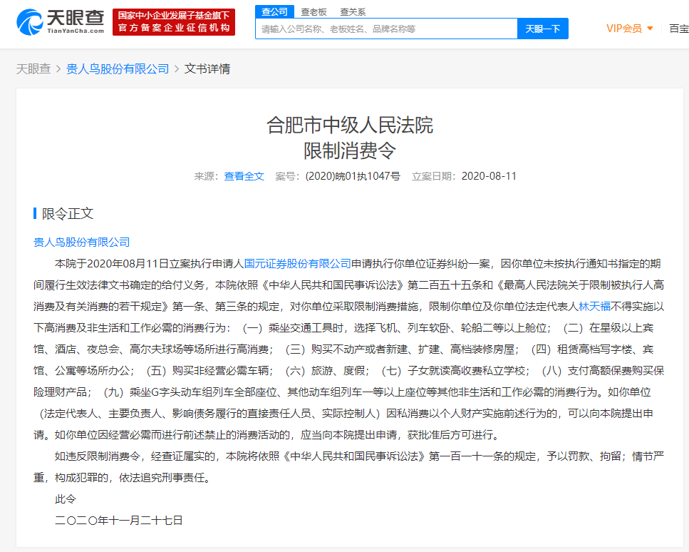 12月1日消息,据天眼查APP显示,近日,贵人鸟股份有限公司及贵人鸟创始人林天福收到限制消费令,发布法院为合肥市中级人民法院,案号为(2020)皖01执1047号。
