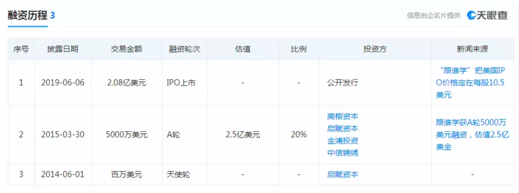而跟谁学融资历程仅三轮,在2015年获得5000万美元这一在当时刷新在线教育行业A轮融资金额纪录的融资之后,就再没收到过一级资本市场的垂青,转向二级资本市场。