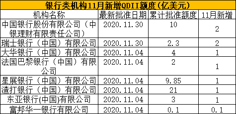 具体来看,银行类机构额度在11月份新增9.1亿美元额度至159.5亿美元,中国银行股份有限公司(中银理财有限责任公司)、瑞士银行(中国)有限公司等8家银行或银行理财子公司均获新增,其中,富邦华一银行有限公司获批0.1亿美元QDII额度,此次是首次获批QDII额度。