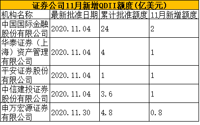 与基金公司同属证券类机构的证券公司方面,11月共有5家券商及券商资管获新增额度,其中,中国国际金融股份有限公司新增2亿美元额度,华泰证券(上海)资产管理有限公司、平安证券、中信建投证券分别新增1亿美元额度,平安证券也是首次获批QDII额度的证券公司。